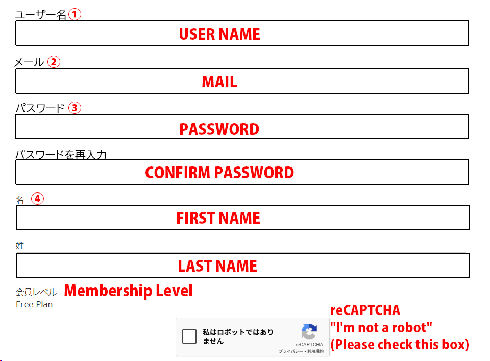 入力必須項目:「ユーザー名」「メール」「パスワード」